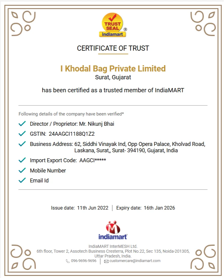 I Khodal Bag Pvt. Ltd. is a leading name in the Indian bag manufacturing industry, known for its uncompromised quality, innovative designs, and commitment to customer satisfaction. Based in Surat, Gujarat, the company specializes in producing a wide range of bags including school bags, travel bags, office bags, duffle bags, laptop bags, and customized promotional bags.